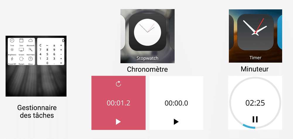 Par ailleurs, le logiciel sait déjà utiliser le vibreur des périphériques afin de réveiller ou de notifier leur propriétaire. Les applications déjà disponibles sont au nombre de 5 : agenda, chronomètre, minuteur, alarme et calculatrice, et on peut les trouver en glissant son doigt vers le bas puis en faisant défiler la liste horizontalement. Pour les fermer, il suffit de faire un slide vers le bas de l’écran, et pour la réduire, vers la droite. On atteint les paramètres d’un geste vers le haut depuis l’écran de démarrage : ceux-ci proposent déjà de changer heure et date sans passer par son smartphone, d’ajuster la luminosité de l’écran ou encore d’éteindre la montre.